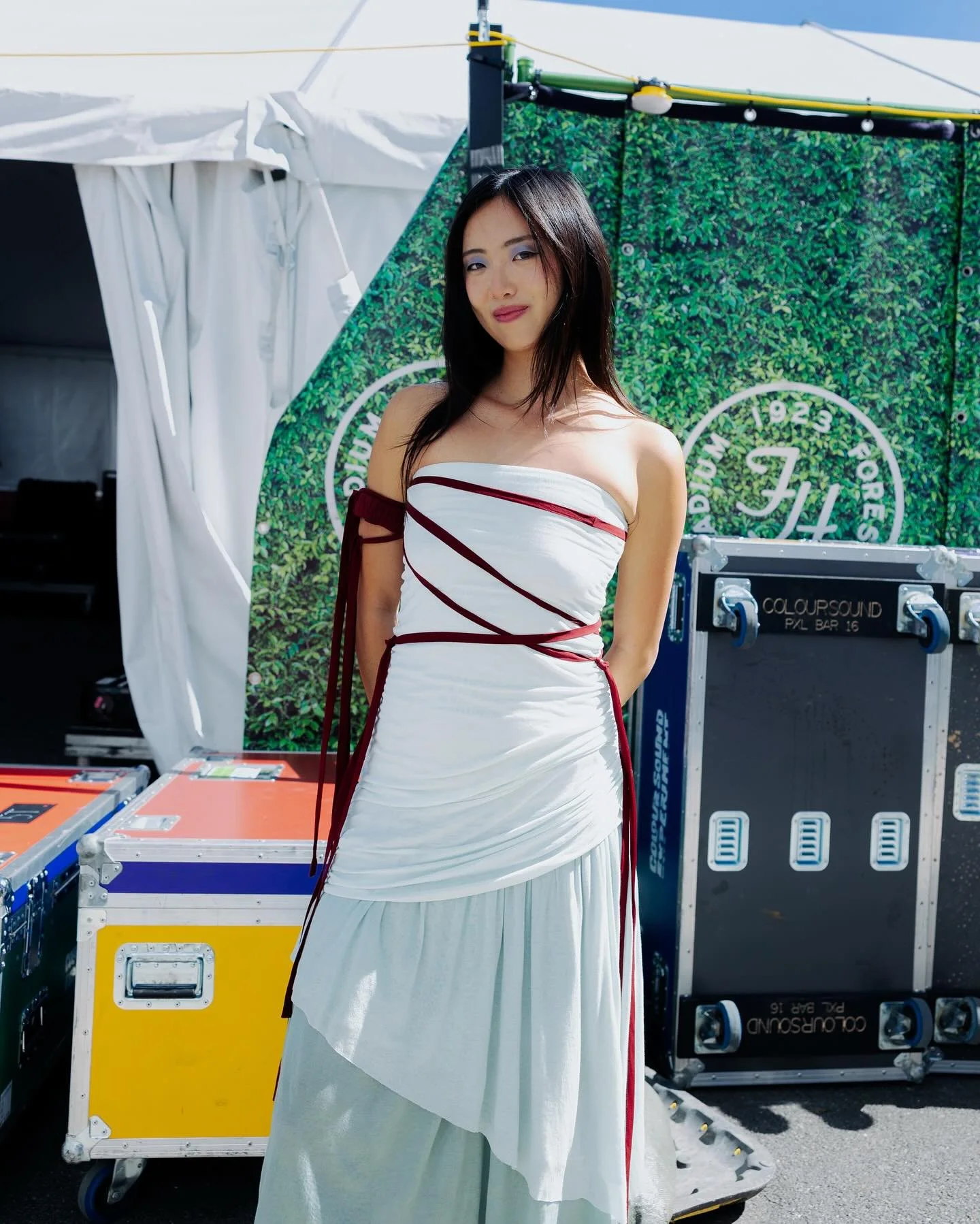 Strapless cut & sew knit dress with micro silk drawstring and tiered asymmetrical skirts. Finished with custom red silk chiffon ribbons. Worn for “Fleeting” single cover and performance at All Things Go