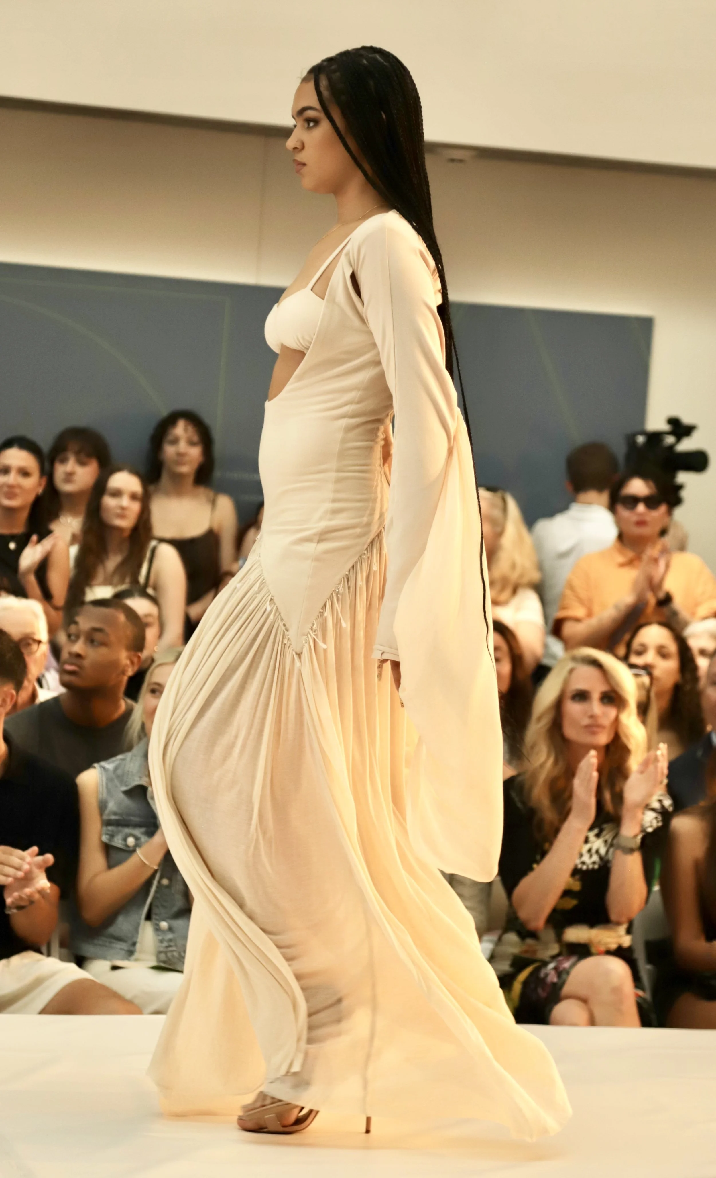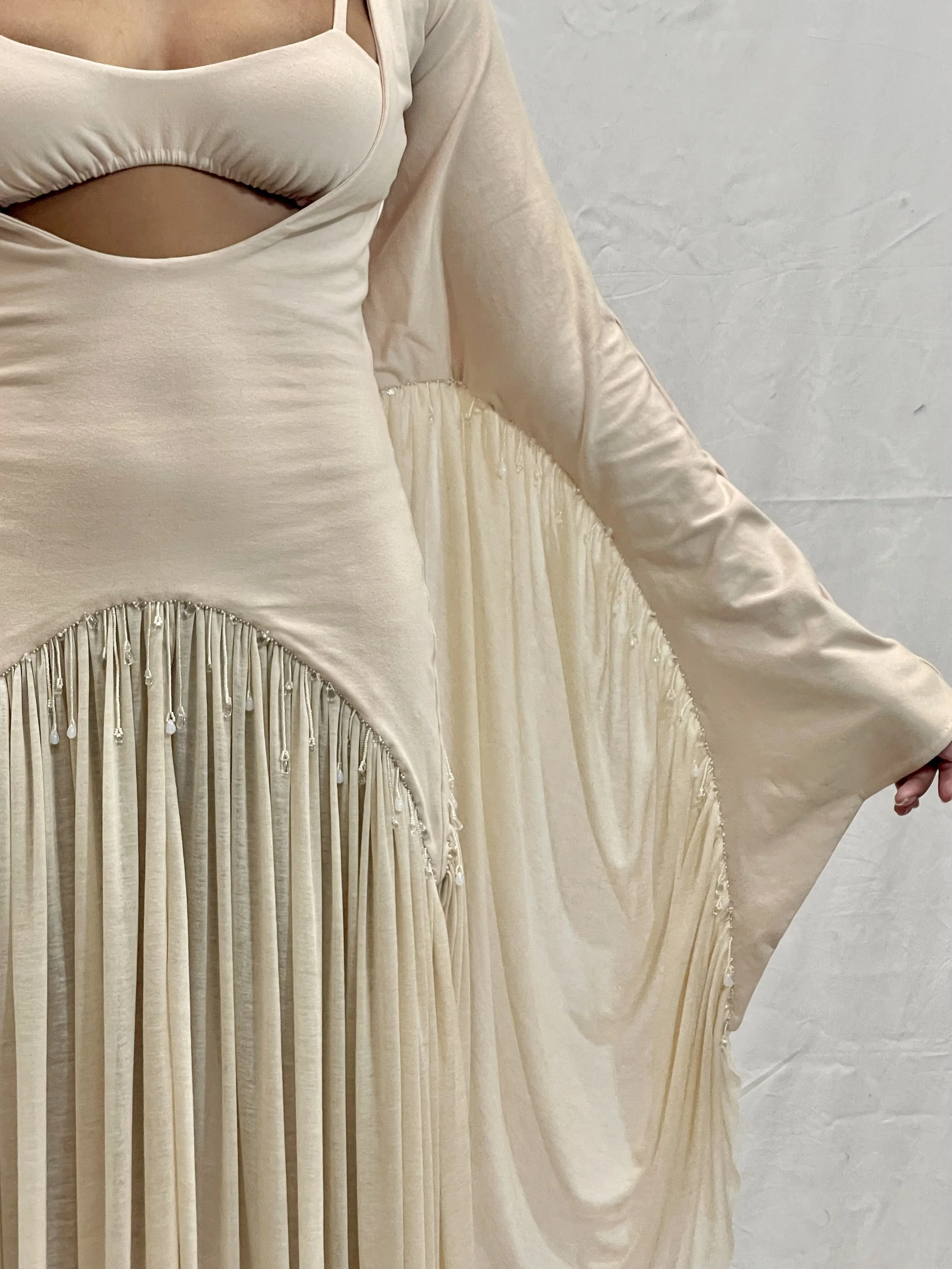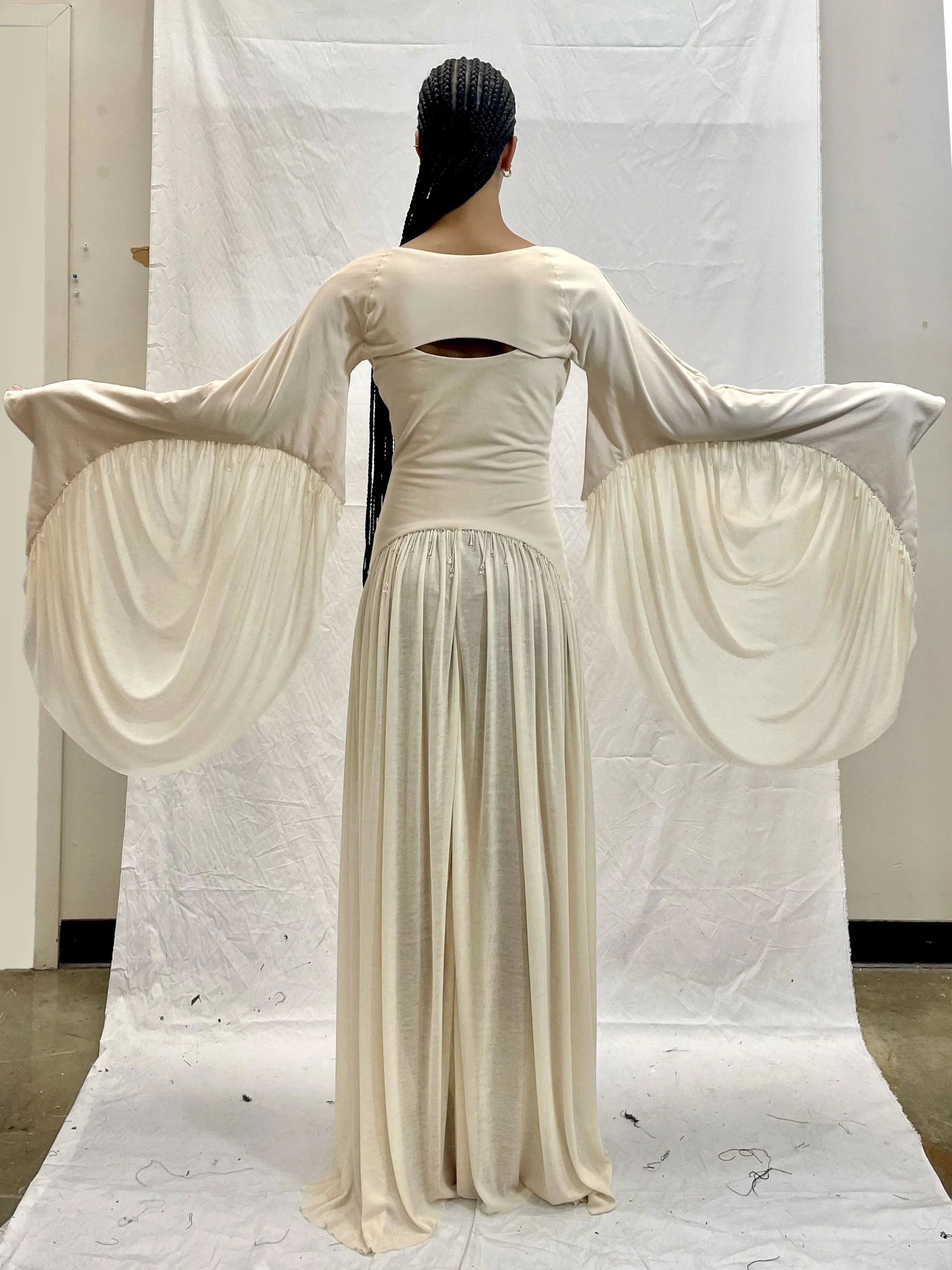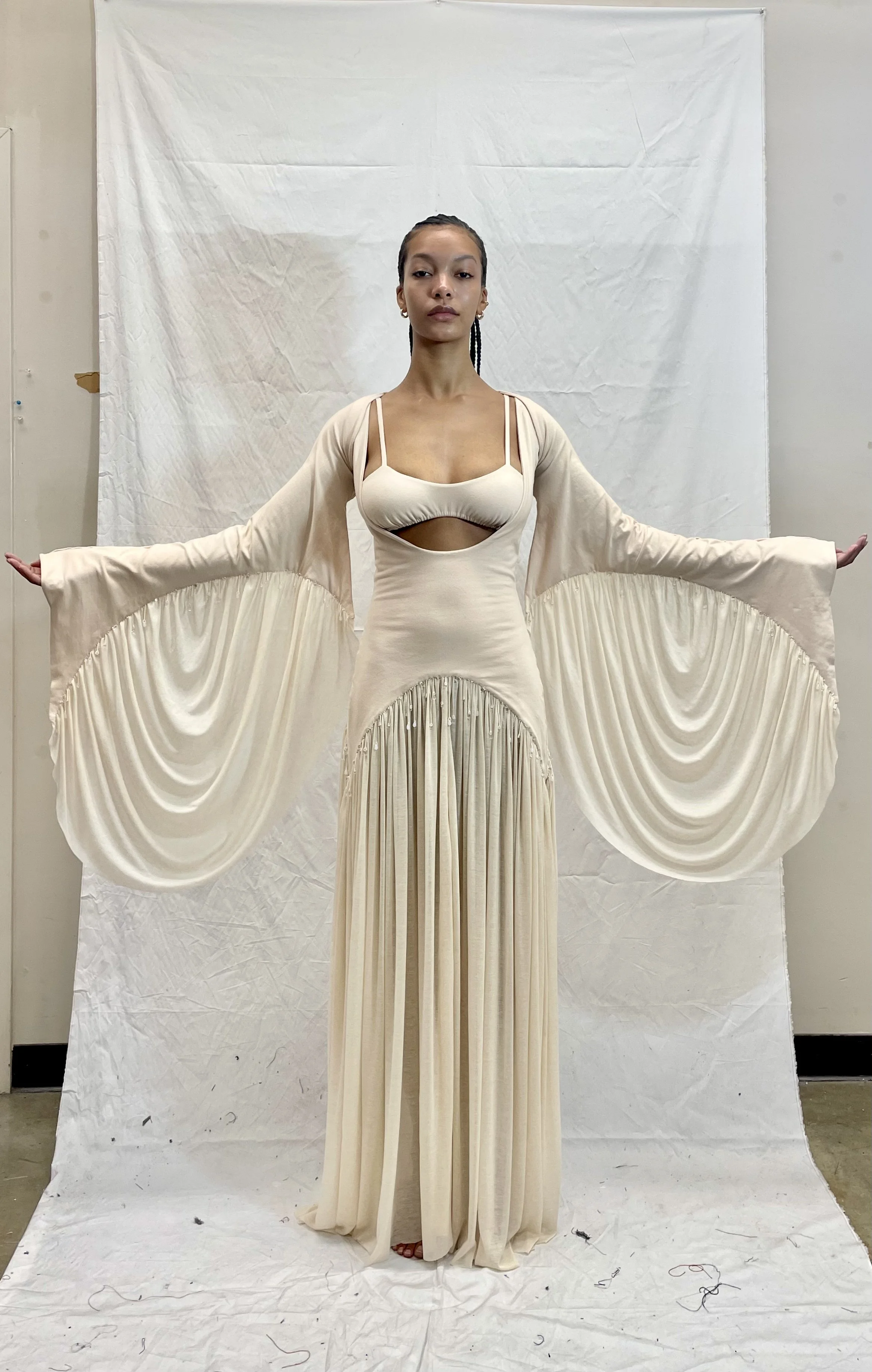 Three-piece cut & sew knit ensemble. Draped sleeves, plunge maxi dress, and gathered bralette. Finished with glass seed bead and teardrop embellishments.
